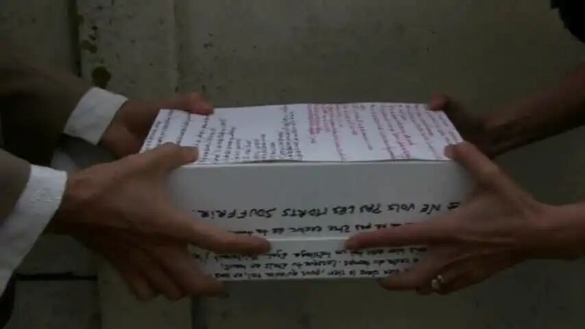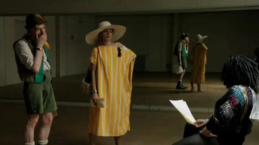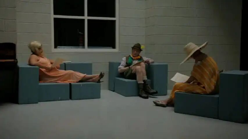 PL:我当然同意合作,但条件是不仅能帮忙剪辑已有素材,还要参与新素材的拍摄。我们想到将那些被让娜偷偷录制的“艺术赞助者”访谈搬演出来。我们分配了角色,并邀请了曾与让娜在剧院合作过的朋友玛琳·萨尔达纳:她钟爱各种滑稽装扮。我们决定让玛琳始终扮演那些权威机构的代表:官僚、赞助商;让娜始终扮演自己;而我则像莎士比亚喜剧中的弄臣,不断变换着立场:时而是让娜的制片人,时而是投资方助理,但总穿着同一套戏服。